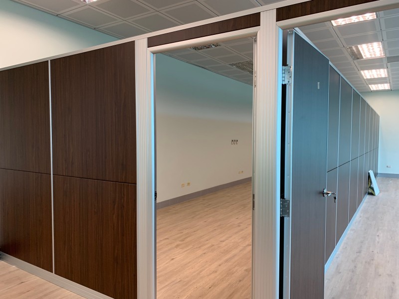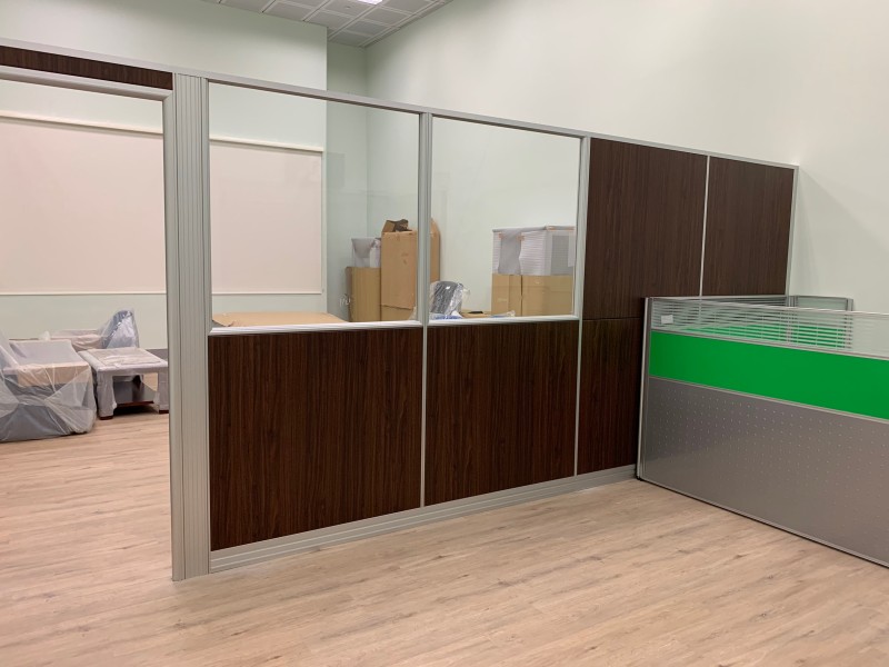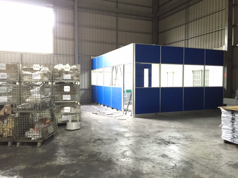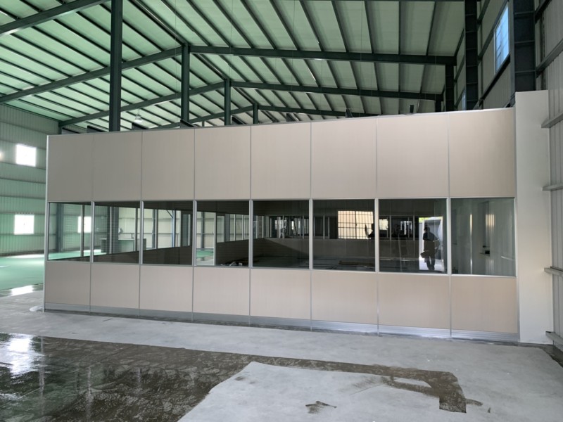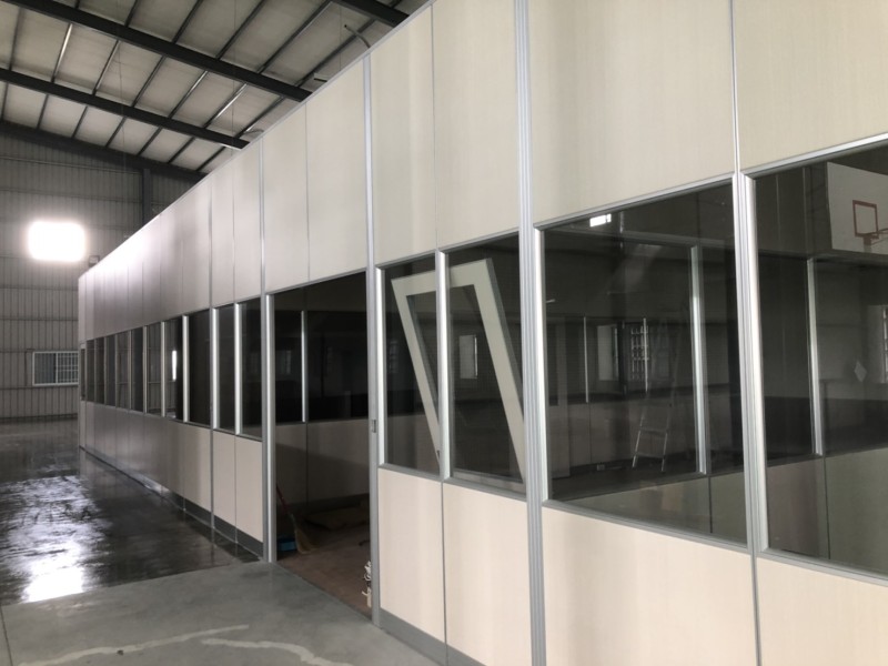 - 一種細框鋁構與板材組合的半高隔間系統,厚度約6cm,固定在牆面與鎖地,不需接到天花板。常見於廠房一隅設置獨立辦公區、設備控管室、會議洽談區或臨時專案室,施工迅速、維護簡易。